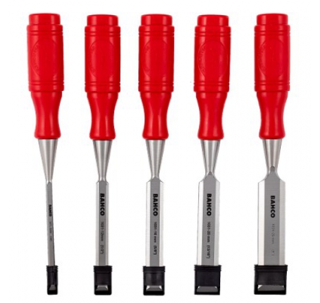 Ripping chisel set, 5-piece, consisting of ripping chisel with blade width 6, 12, 16, 20 and 25 mm. Handle made of high-strength red plastic, blade made of high quality tool steel with a conical neck, with complete bevel, i.e. the long sides of the blade are bevelled up to around half of the blade thickness , finely ground and can be used immediately.