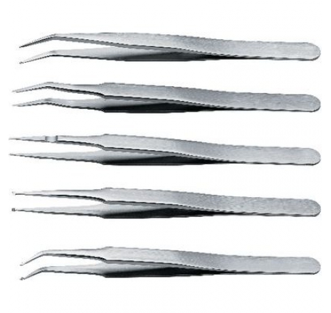 Set of 5 SMD tweezers. Surgical stainless steel, acid-resistant, non-rusting, anti-magnetic. Resistant to nitric and hydrofluoric acids. Matt, non-glare surface; for handling and inserting SMD components. Appropriate spare parts: 348950 SMD tweezers RUBIS 348960 SMD tweezers RUBIS 348980 SMD tweezers RUBIS 348990 SMD tweezers RUBIS 349000 SMD tweezers RUBIS