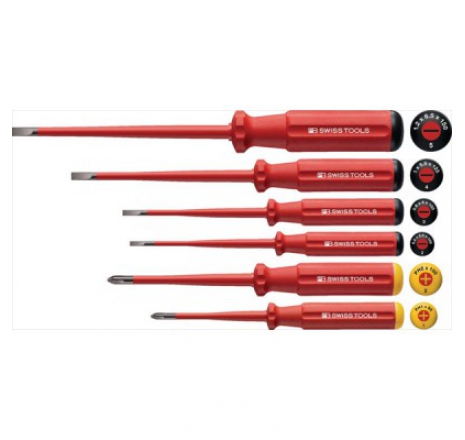 PB 5542 SL, Classic VDE slim screwdriver set, fully insulated up to 1000 V AC/1500 V DC in accordance with IEC/EN 60900. Reduced blade diameter, integrated insulation. Suitable for low-lying screws and spring elements. Slim handle with skin-friendly, non-slip elastomer coating and polypropylene core. For fast turning, for fine-tuning work, space-saving.