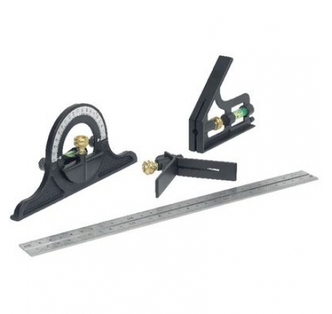 With angle measurer and centring square - For use as a protractor, straightedge, rule, depth gauge, stop square, centring square and mitre square, and as a spirit level with bubble tube. Fixed scale 300 mm of hardened stainless steel. Angle part, angle measurer and centring square are made of light metal alloy.